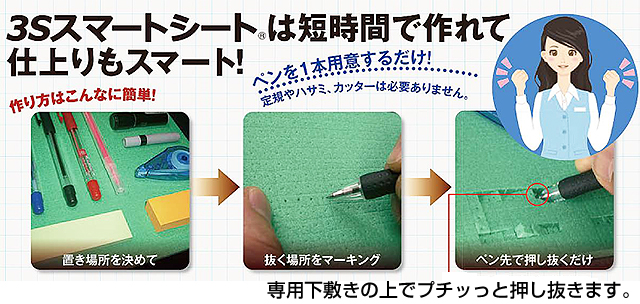 3Sスマートシートならペンやスタンプ、ステープラーなど形に合わせてペン先で抜くだけで簡単にスマートにそして楽しく整理ができます。できるオフィスのキーワード「3S活動」に最適のアイテムです。